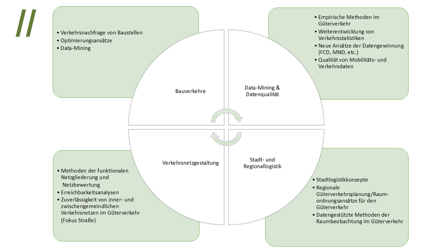 Der Güterverkehr spielt in der städtischen Verkehrsplanung bisher nur eine untergeordnete Rolle, da es keinen direkten gesetzlichen Auftrag an die Kommunen gibt. Nachhaltige städtische Logistikpläne (SULP) zielen darauf ab, die negativen Auswirkungen des Straßengüterverkehrs auf die städtische Umwelt und Lebensqualität zu minimieren. In städtischen Güterverkehrskonzepten können Vorschläge für die Gestaltung der für den Güterverkehr vorgeschlagenen Flächen gemacht werden. Nach dem Scheitern der City-Logistik in den 1990er Jahren gewinnen zusätzlich innovative Maßnahmen im städtischen Güterverkehr wieder an Bedeutung wie die Belieferung mit Lastenrädern oder neuartige Bündelungskonzepte, die der Lehrstuhl ebenfalls in Projekten betrachtet.
